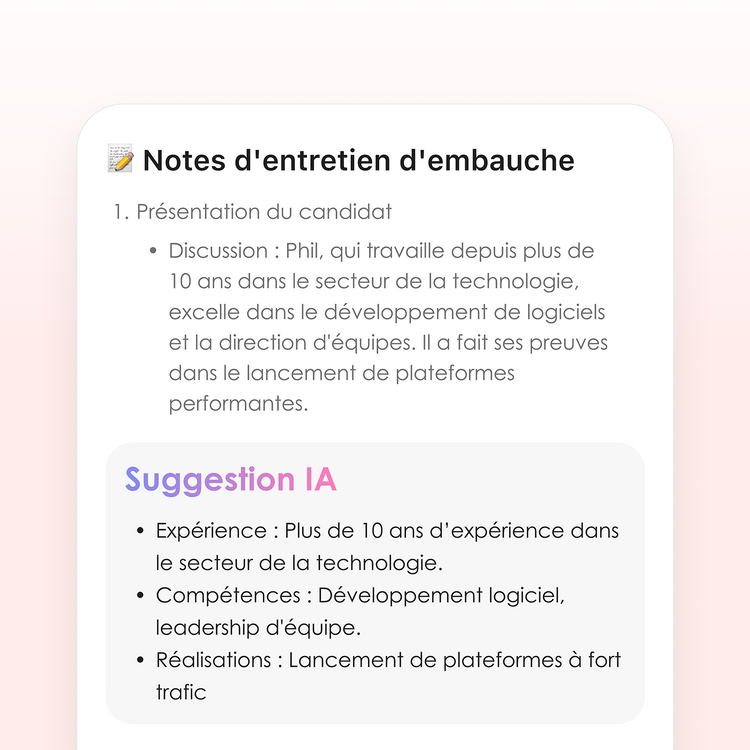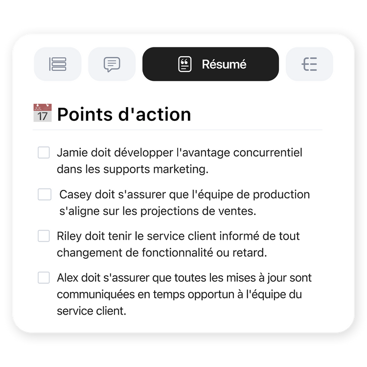 Extrayez automatiquement les points importants des réunions et conversations. Gagnez du temps sur les suivis tout en garantissant le respect de tous les engagements.